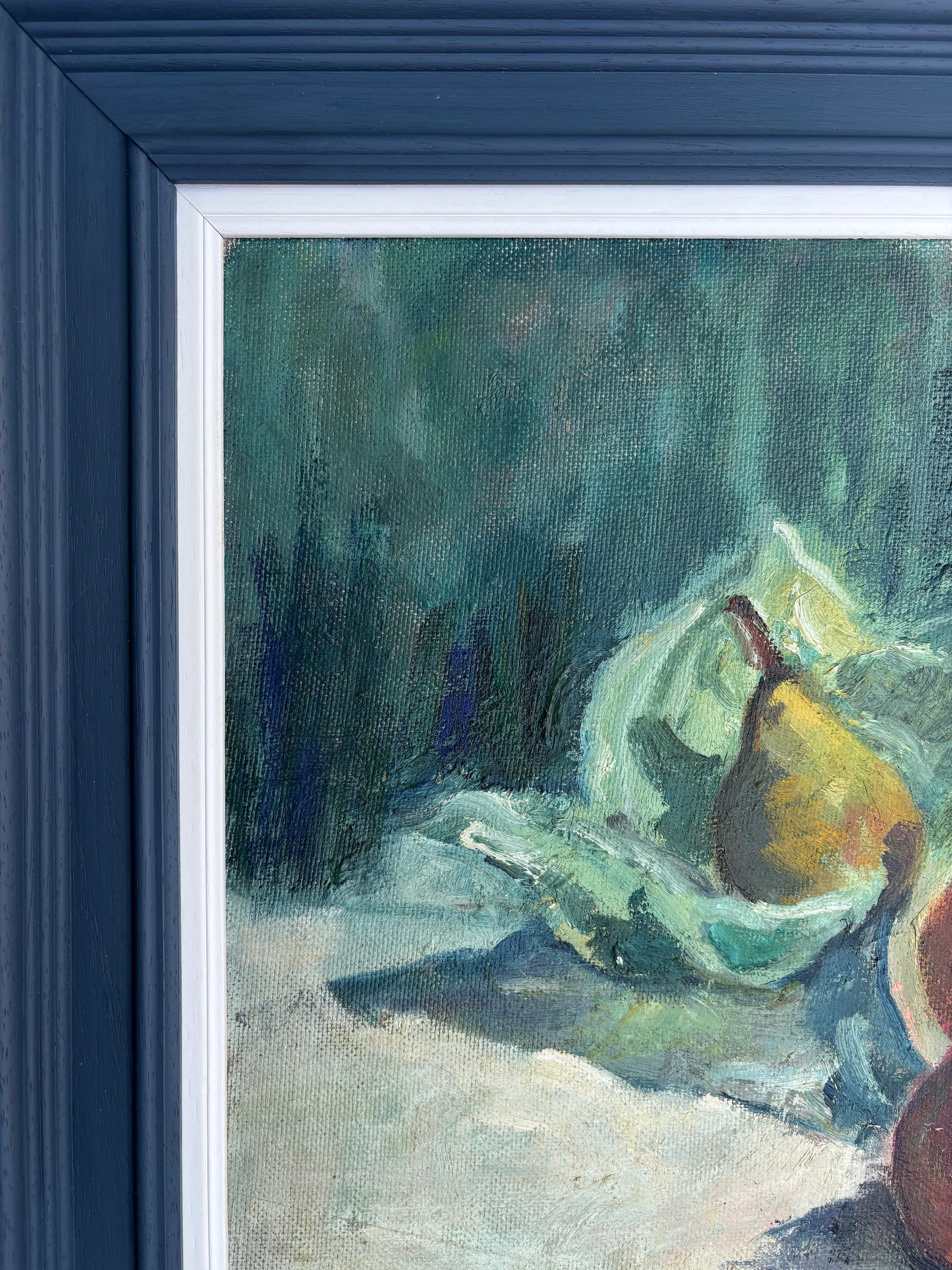 Indulge in the beauty and tranquility of nature with this captivating still life painting. Admire the vibrant colours of apples, pears, and blue flowers, while feeling a sense of peace as you gaze upon the delicate mushrooms. Perfect for adding a touch of elegance to any room.